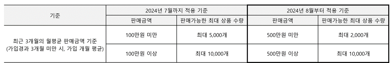 - 최초 가입 계정의 경우 판매가능 상품수량이 2,000개로 설정되며 1개월 후 판매금액 기준으로 수량이 부여됩니다.